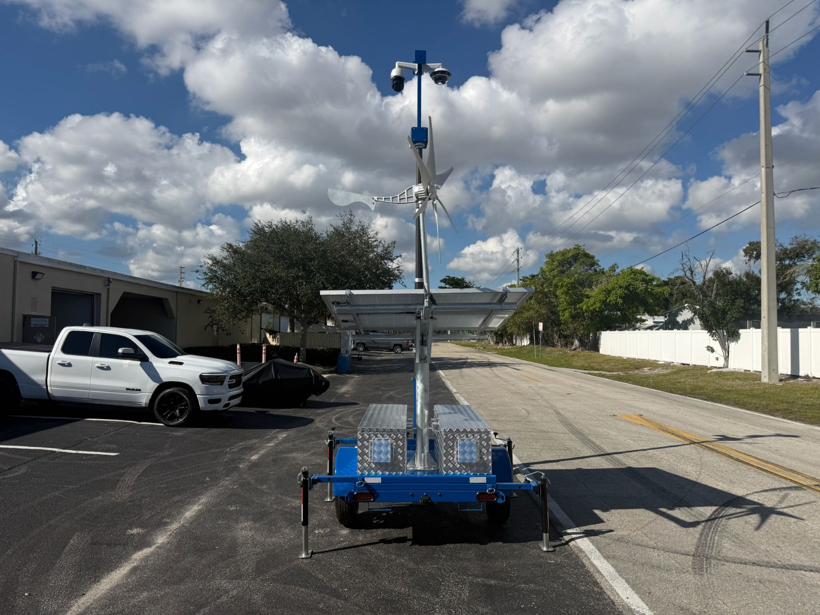 Roof-mounted solar array with battery storage enables off-grid operation without trenching or utility power, making the system ideal for remote and temporary deployments.